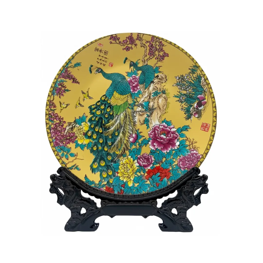 Transforme cualquier rincón de su hogar en una galería de arte con nuestro Plato Cerámico de 10″, una pieza ornamental que celebra la majestuosidad y la belleza eterna. Este plato destaca por su vibrante fondo amarillo dorado, sobre el cual se despliega una escena magistral de pavos reales rodeados de peonías en flor, símbolos milenarios de nobleza, integridad y prosperidad. Acompañado de una base de exhibición elegantemente tallada, este plato no es solo un objeto decorativo, sino un testimonio de la delicadeza artesanal asiática, diseñado para aportar un aire de sofisticación y armonía cultural a su entorno.